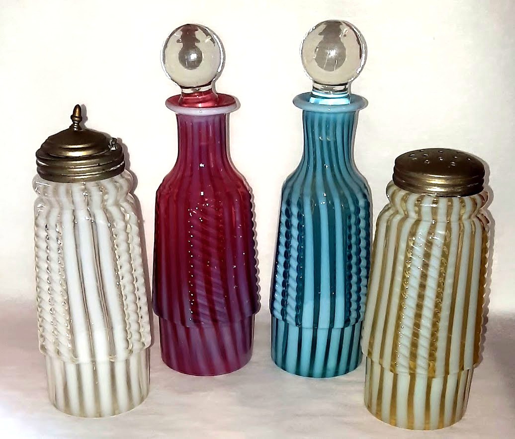 AKA: Opal Stripe Caster | Buckeye Glass Company | square, notches ring neck | None | Opalescent stripe in White, Blue, Cranberry and Canary (vaseline) |