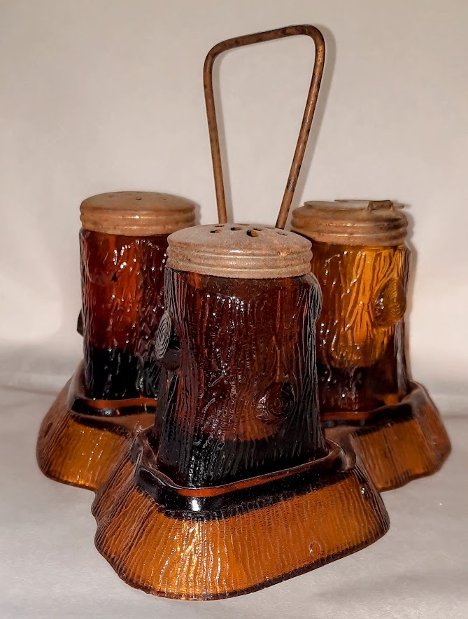 #1 Three Bottle Caster | Specialty Glass Company | Cut Log, Tree Bark | Opalware examples may have hand painted designs | Crystal, Opalware, Transparent Amber, Transparent Blue |