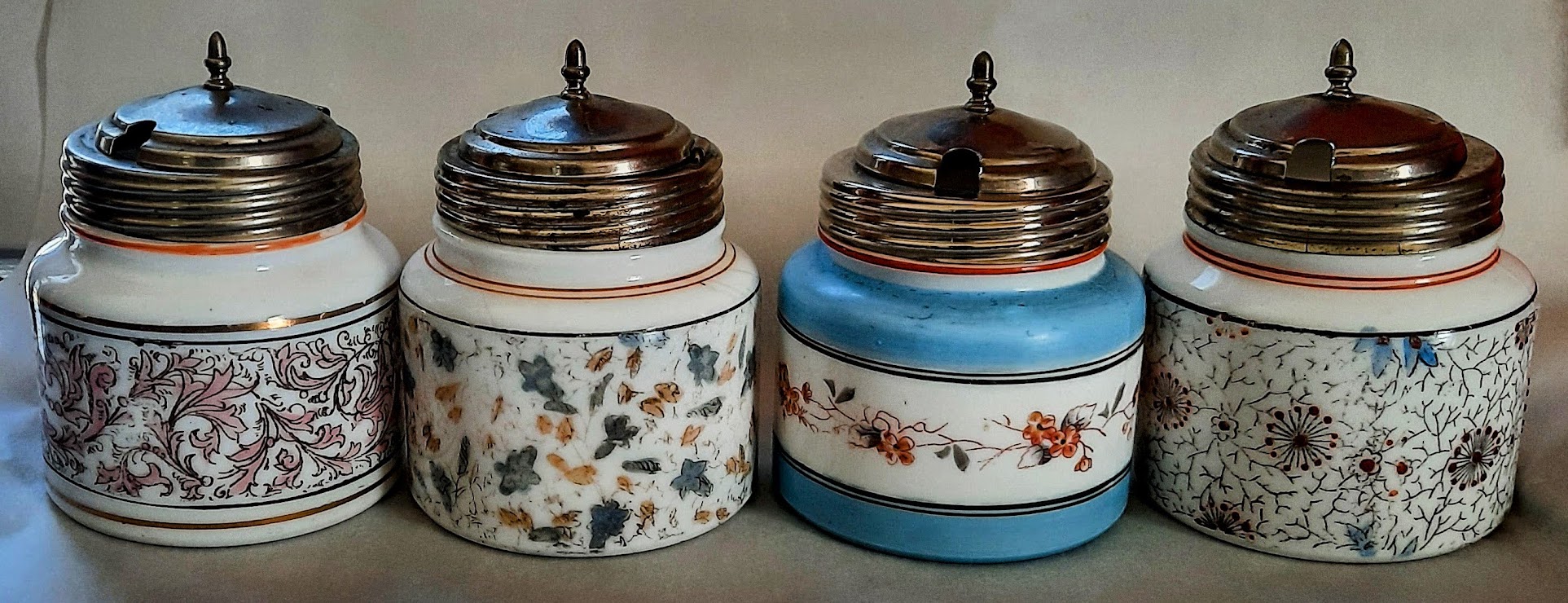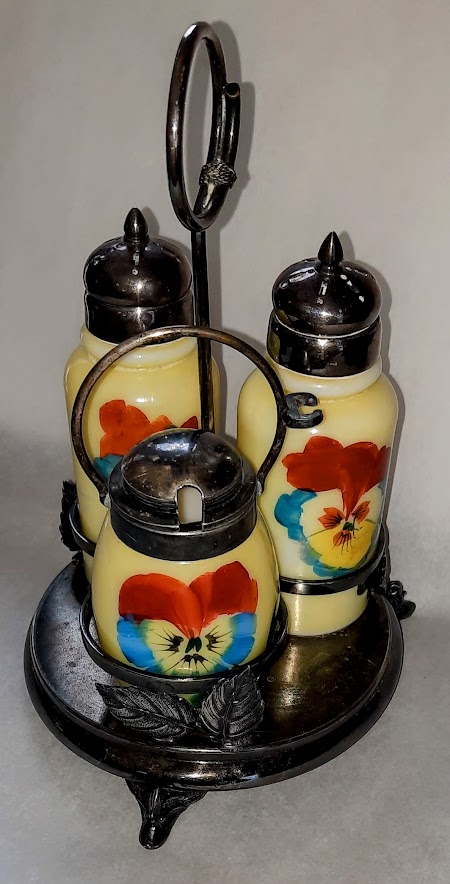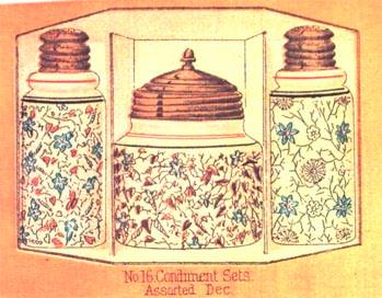 OMN: #16 Condiment Set | Challinor Taylor and Company | round squat | Various transferware designs | Opalware with various tints and designs |