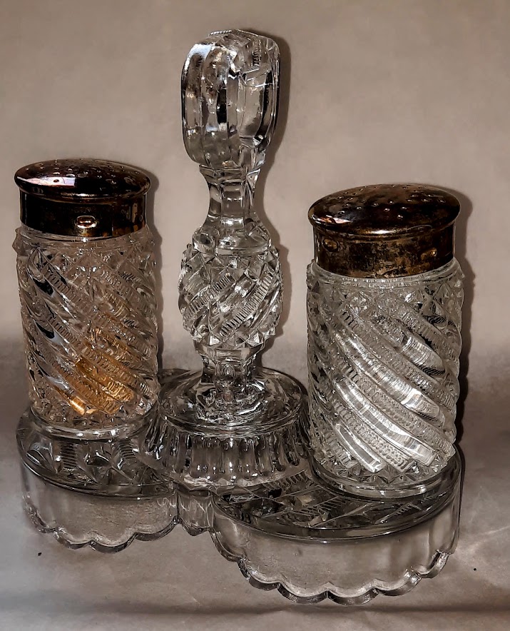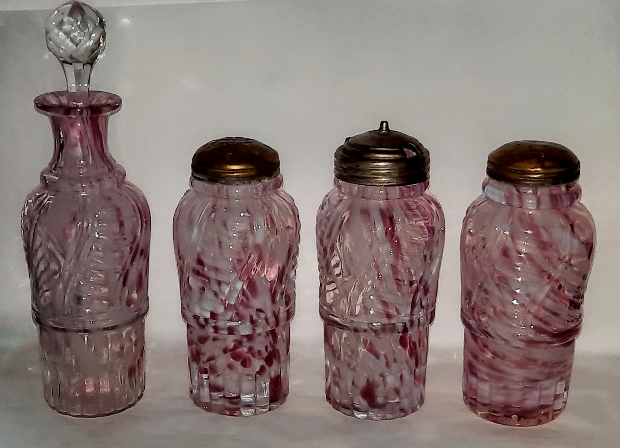 OMN: Barry Caster AKA: Leaf Twisted | Consolidated Lamp and Glass Company | leaf barrel | None | Crystal base and Rose (Dark Pink) Bottles. Cruet has a crystal faceted stopper |