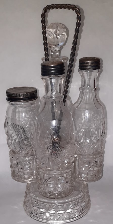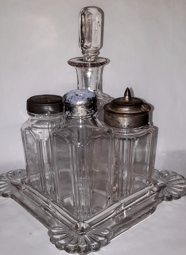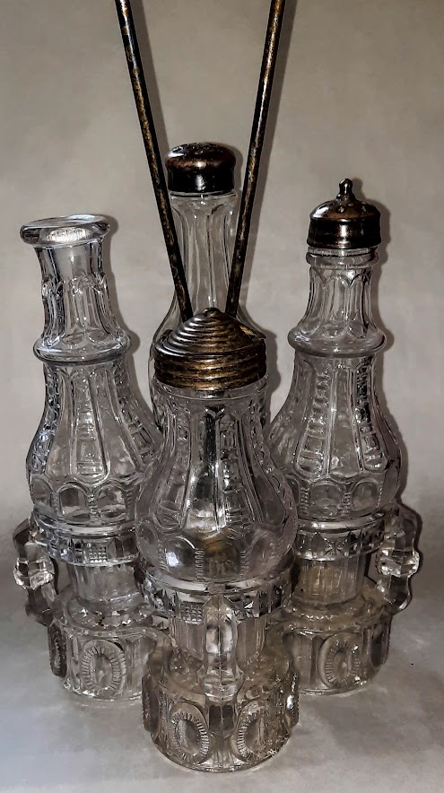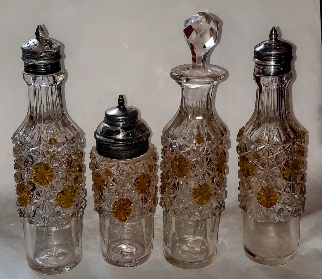OMN: Stanley Caster Set AKA: Jumbo | Greensburg Glass Company | jumbo elephant | None | Crystal, Amber, Blue |