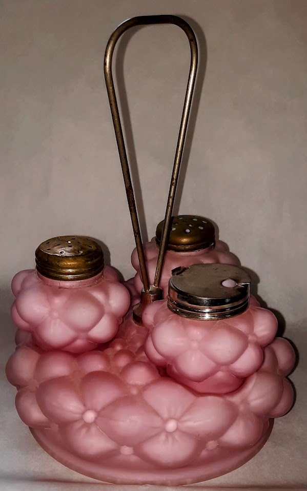OMN: Quilt Caster Set AKA: Bulging Petal | Fostoria Shade & Lamp Company/Consolidated Lamp and Glass Co | quilt puffy dot | None | Opaque Pink, Light Blue, Dark Blue, Yellow in both Glossy and Satin |