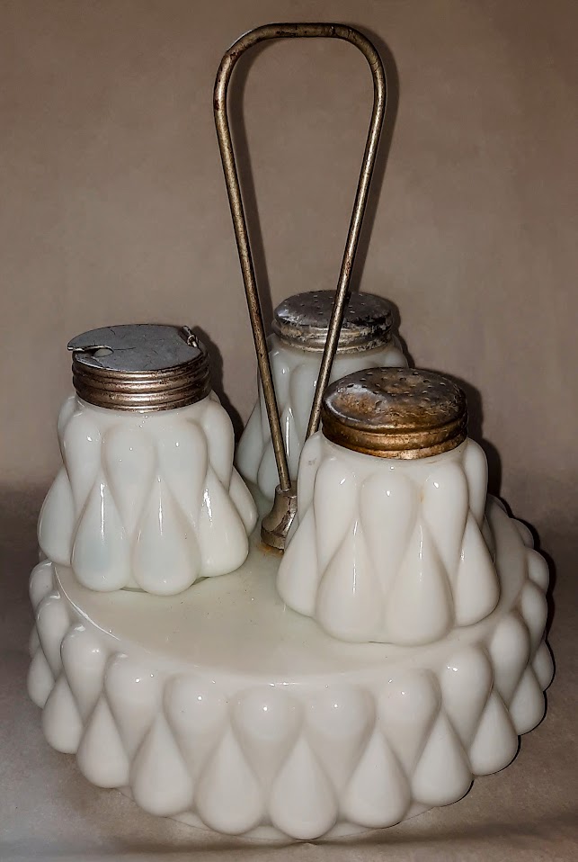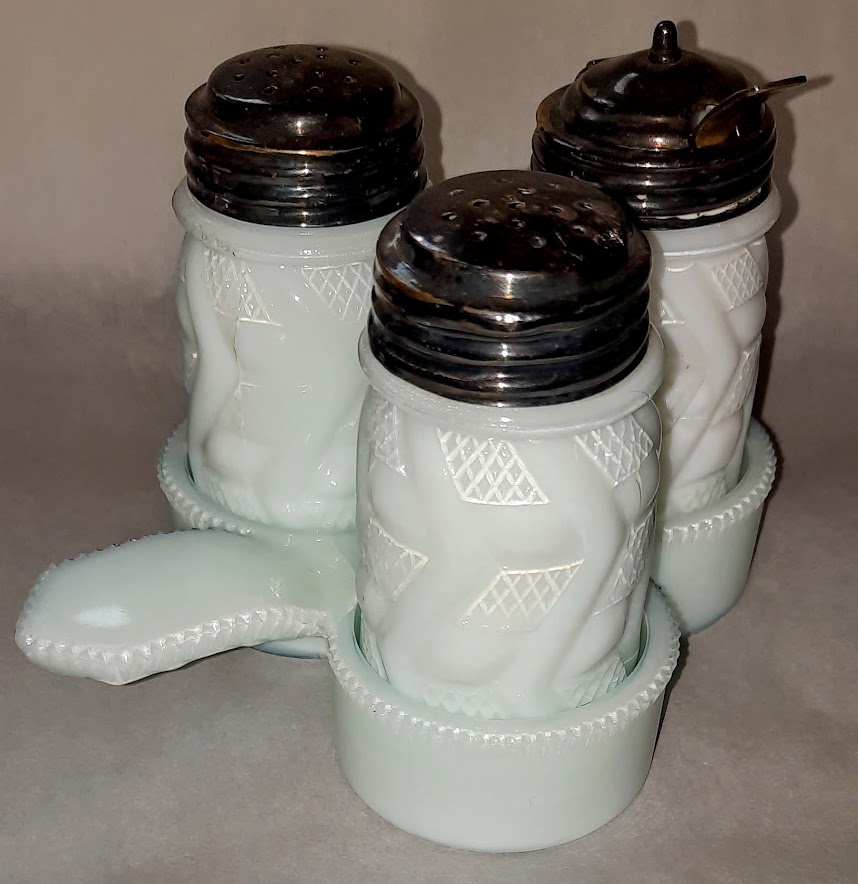 OMN: Maize | Libbey and Sons / Libbey Glass Company | corn | None | Opalware shakers and Mustard has also been found in Marigold Carnival |