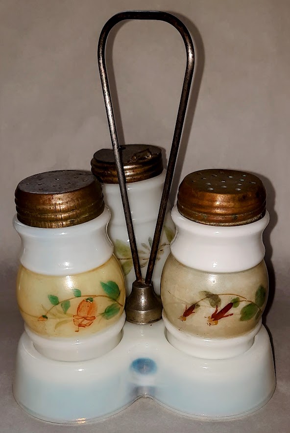 OMN: Opal Caster AKA: Scroll, Triple Bulge | Fostoria Glass Company | ring neck ovals Round scroll | HP diferent flower in each bulge; HP scrolls | Opalware (white) |